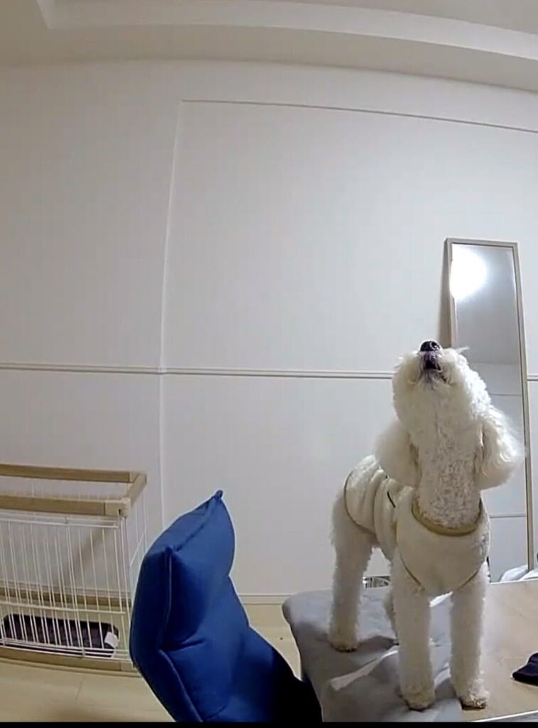 ペットカメラで留守番中の犬の様子を確認すると、なんと犬がこたつテーブルに乗って、上を向いて「アオーッ」などと高らかに遠吠えをしていました。