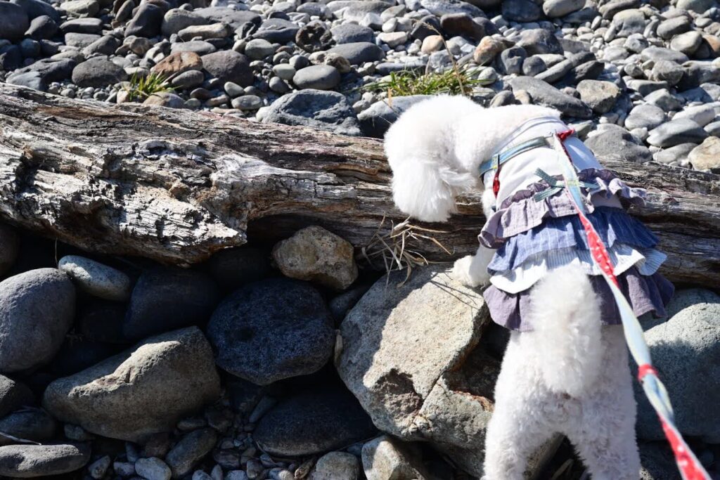 川原の石の上を歩いていると、犬は落ちている流木に興味津々。